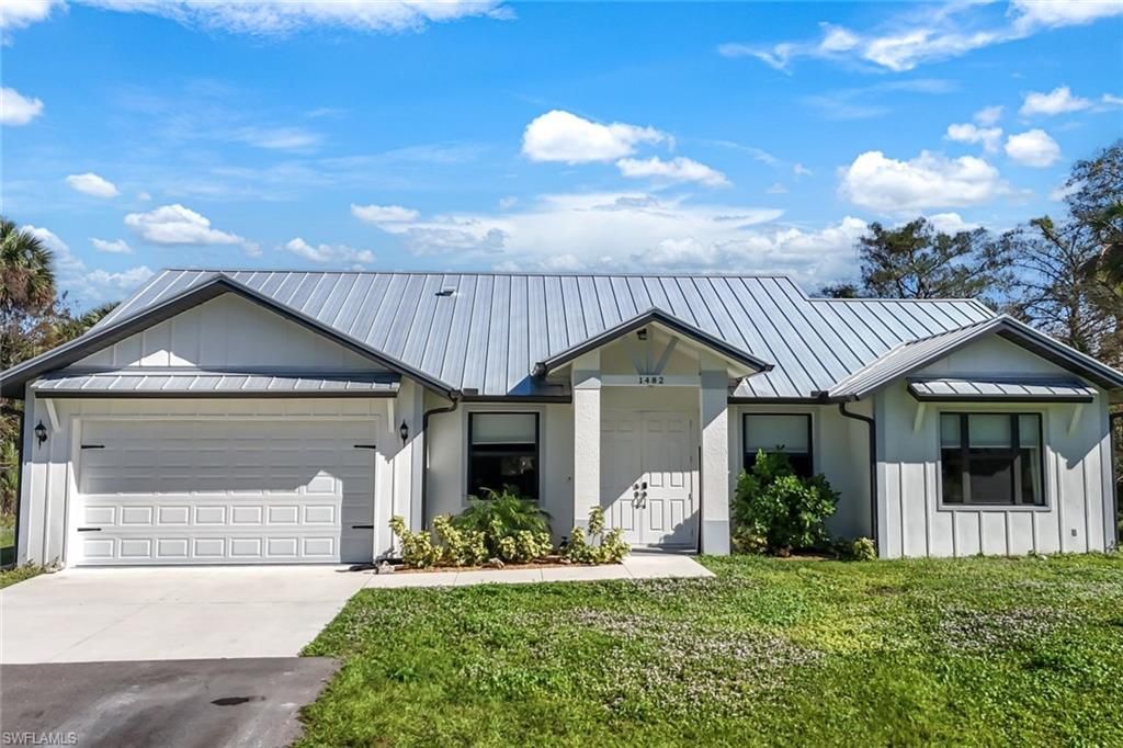 Incredible opportunity to own a NEWER 2022 home on 1.25 acres, WEST of Wilson in Golden Gate Estates! Charming and spacious home includes 3 bedroom plus a den, 2 full bathrooms, attached 2 car garage with extra parking spaces in the driveway. The main bedroom has a large WALK-IN CLOSET, tray ceilings, bathroom has DUAL SINKS, WALK-IN SHOWER and separate tub. The property is fully FENCED with a 4 foot high chain linked fence that has 2 gate accesses. There is plenty of room to add a pool! Metal roof which has well over 40 years life expectancy ! impact glass windows and doors and sliders ,screened in lanai. NO CARPET - wood plank style tile throughout the home. The land is all cleared and well groomed. This home was built by Majestic Home Builders - Malaga floorplan, has reverse osmosis , ethernet throughout the house, every room is internet ready, the roof has extra insulation. The Open floorplan is spacious with 9 to 11 foot ceilings, the gourmet kitchen has Stainless steel appliances, 42 inch cabinets. auto sprinkler system, whole house gutters and container in the back which allows for multiples uses.